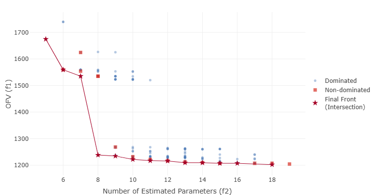 In PopPK model selection, MOGA3 is particularly useful when the user wishes to balance goodness-of-fit, parsimony, and a clinically relevant prediction metric. For example, objectives might include OFV, total number of estimated parameters, and bias in a steady-state trough concentration for a key analyte. The resulting Pareto front typically contains models that are better in different respects: some are more parsimonious, some provide a better fit, and others reduce bias in the clinically important exposure metric.